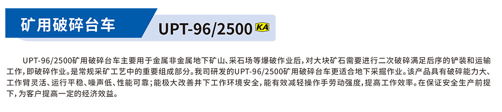 UPT-96/2500礦用破碎臺車(chē)主要用于金屬非金屬地下礦山,采石場(chǎng)等爆破作業(yè)后,對大塊礦石需要進(jìn)行二次破碎滿(mǎn)足后序的鏟裝和運輸工作,即破碎作業(yè)。是常規采礦工藝中的重要組成部分。我同研發(fā)的UPT-96/2500礦用破碎臺車(chē)更適合地下采掘作業(yè)。該產(chǎn)品具有破碎能力大。工作臂靈活、運行平穩、噪聲低、性能可靠;能極大改善井下工作環(huán)境安全,能有效減輕操作手勞動(dòng)強度,提高工作效率。在保證安全生產(chǎn)前報下,為客戶(hù)提高一定的經(jīng)濟效益。